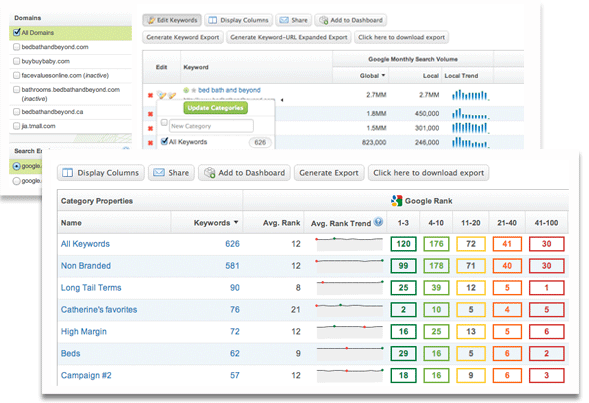 在Searchlight中,關(guān)鍵詞類目是非常靈活的,一切由你來決定如何去跟蹤。類目可以用來監(jiān)控和衡量你組織的,戰(zhàn)術(shù)的,或者戰(zhàn)略的目標,而這些是以前所沒有的。在你的關(guān)鍵詞種類中,為你及競爭對手獲得詳細的洞察力,以便觀察你如何對比市場份額,關(guān)鍵詞性能,以及分析度量,并能讓你發(fā)現(xiàn)更多競爭者。